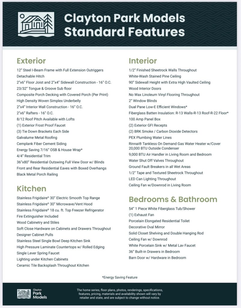 Clayton Park Models, formerly known as Lakeside, is one of the three top-tier manufacturers we proudly partner with. Below, you’ll find a wide variety of floor plans they offer, each designed with thoughtful features that often come as upgrades from other builders. With Clayton, you get exceptional value, as many premium amenities are included in the base price.